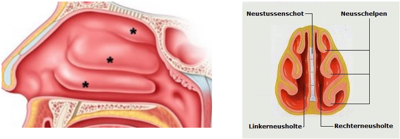 Elke neushelft heeft drie slijmvliesplooien die boven elkaar zitten. Dit noemen we neusschelpen. De neusschelpen verwarmen, bevochtigen en reinigen de ingeademde lucht. Op deze manier wordt 95% van de deeltjes die onze lucht verontreinigen, door de neusschelpen weg gefilterd en onschadelijk gemaakt. De onderste neusschelpen zijn het grootst en geven vaker klachten dan de andere.